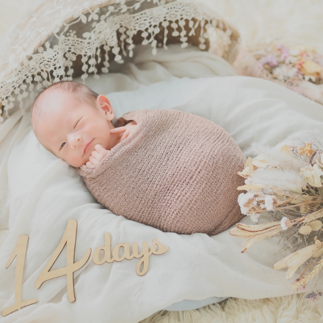- ニューボーンは生後 1週間から3週間がお勧めです。3週間を過ぎるとミノムシ巻きが難しくなりますので、2週間くらいがベストです。