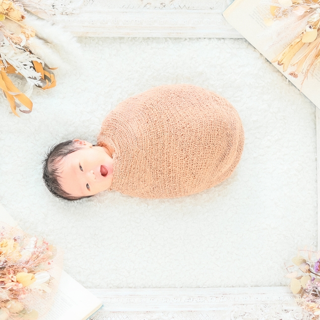 - 着飾るというよりは、新生児らしい雰囲気で撮影したいと思います。ミノムシ巻きや、はだかんぼう、タオルでくるむというスタイル等を提案しておりますが、お持ち込みの衣裳も大歓迎です。